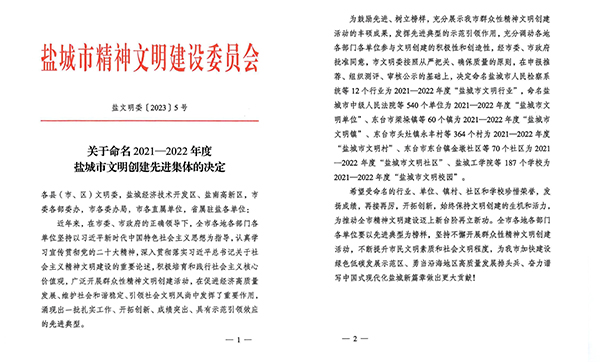 近日,市精神文明建設(shè)委員會(huì)印發(fā)《關(guān)于命名2021—2022年度鹽城市文明創(chuàng)建先進(jìn)集體的決定》,鹽城市海興集團(tuán)被授予“鹽城市文明單位”榮譽(yù)稱號(hào)。2023-10-13 -